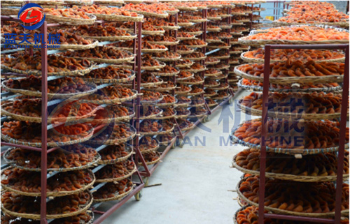 6:第2次烘烤 將捏過的柿果,再次送入烤房,升溫至45——50°,持續(xù)15H左右,使柿果再次快速脫水35%。