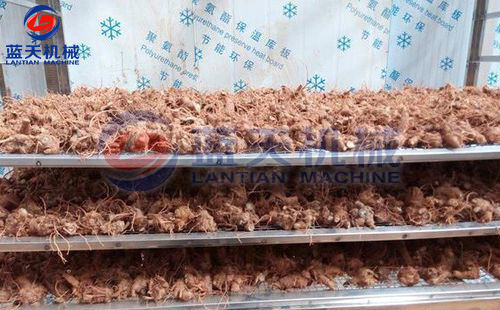 2:先將采收的文山三七挑選裝盤(pán),使用不銹鋼托盤(pán)、合理均勻?qū)⑷邤[放至托盤(pán)架中,每層間隔約為10厘米至15厘米,不宜鋪放太多,擺放以通風(fēng)透氣為佳,這樣每一層三七都能均勻受熱、干燥脫水。