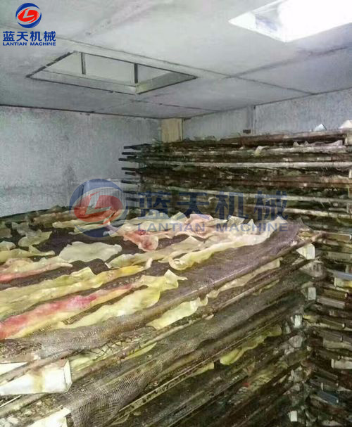 是利用太陽曬干的,整個過程需要持續(xù)四五天的時間,還需要工人在現(xiàn)場看管,但也避免不了蟲蟻灰塵的污染。如遇上陰雨天,豬皮曬干不及時就可能走味,給豬皮的干燥帶來諸多麻煩。