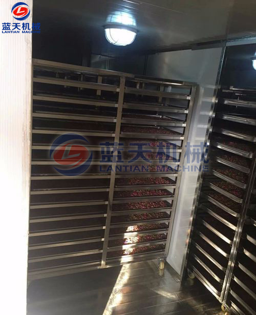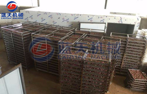裝滿花蕾的物料車要輕輕推入烘干房,關閉烘干房室門升溫,嚴格控制室內(nèi)溫度、依次順序溫度慢慢提升,采用循環(huán)風路,確?;ɡ俑蓾窬鶆?,色澤鮮艷。
