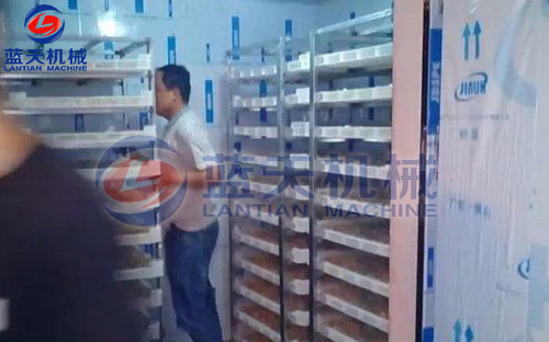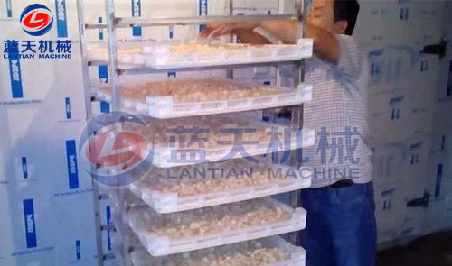 將蒜片均勻鋪放在不銹鋼物料托盤(pán)上,溫度控制在55-60°C左右,烘6-8小時(shí)。烘干過(guò)程中,注意蒜片烘干房的干燥,熱風(fēng)量和排濕氣量要穩(wěn)定,到后期干燥時(shí),由于大蒜纖維細(xì)密且蒜片中液體黏稠,使蒜片水分遷移蒸發(fā)變得緩慢,直至蒜片干燥至含水率約為4-6%以內(nèi)即完成干燥。烘干期間須嚴(yán)格控制好時(shí)間和溫度,以免干燥時(shí)間過(guò)長(zhǎng),溫度過(guò)高,使蒜片干色澤、外形及營(yíng)養(yǎng)價(jià)值受損,影響蒜片的品質(zhì)。