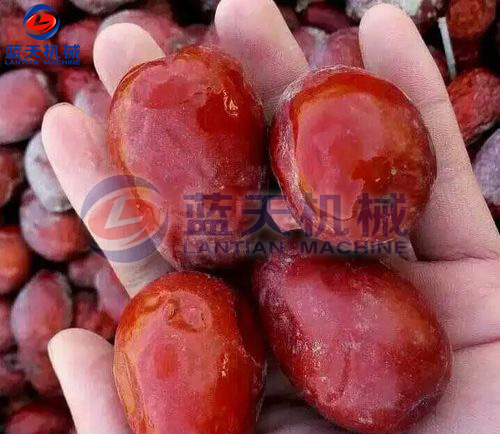 1、選料去核:要求用肉厚、皮薄、核小、含糖量高的紅棗;棗體完整、大小均勻、無(wú)蟲(chóng)蛀、無(wú)霉?fàn)€、完全成熟、充分曬干。選好后用捅核機(jī)把棗核取出,出核口要小。手工取核時(shí),可用小刀從兩端旋口取出。