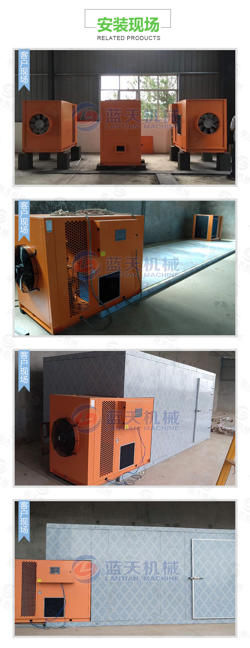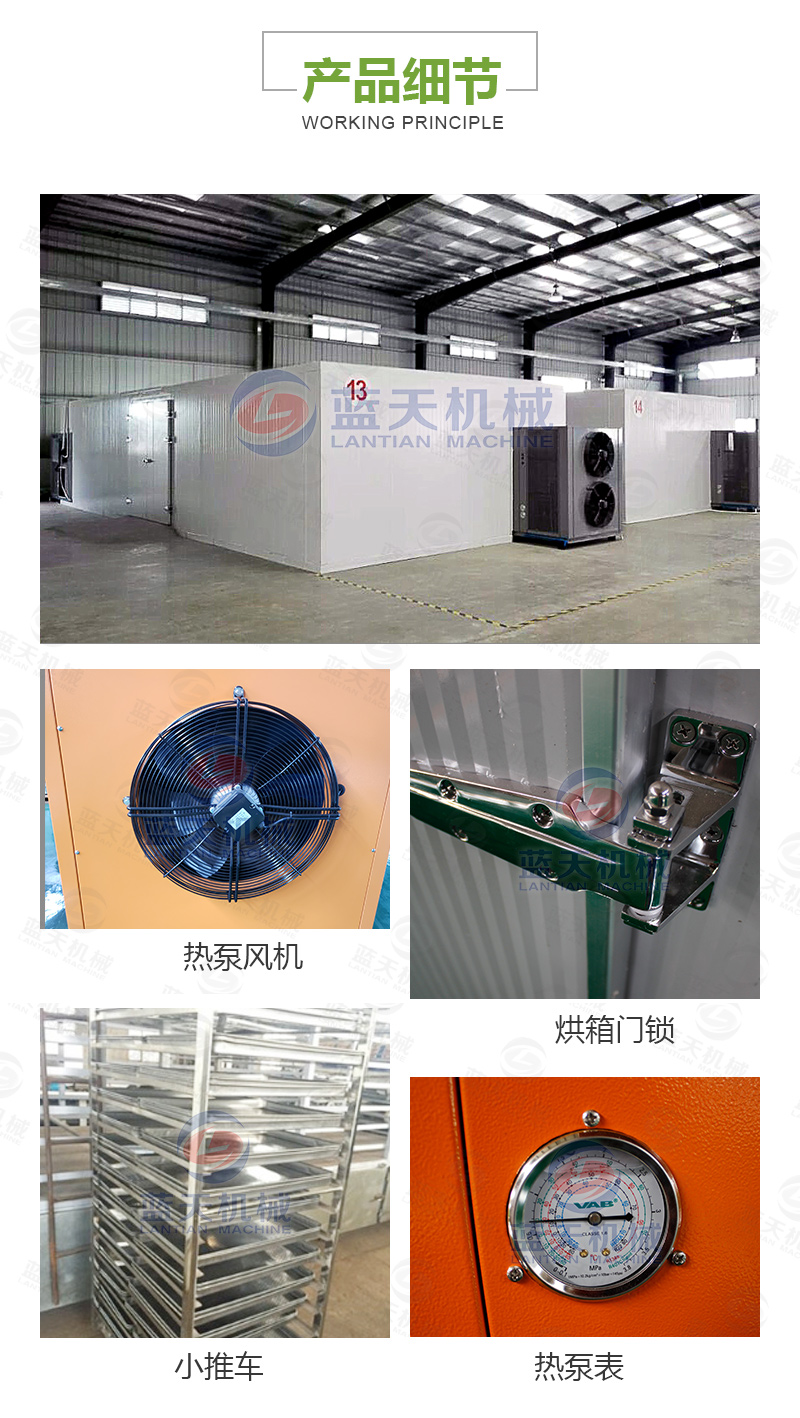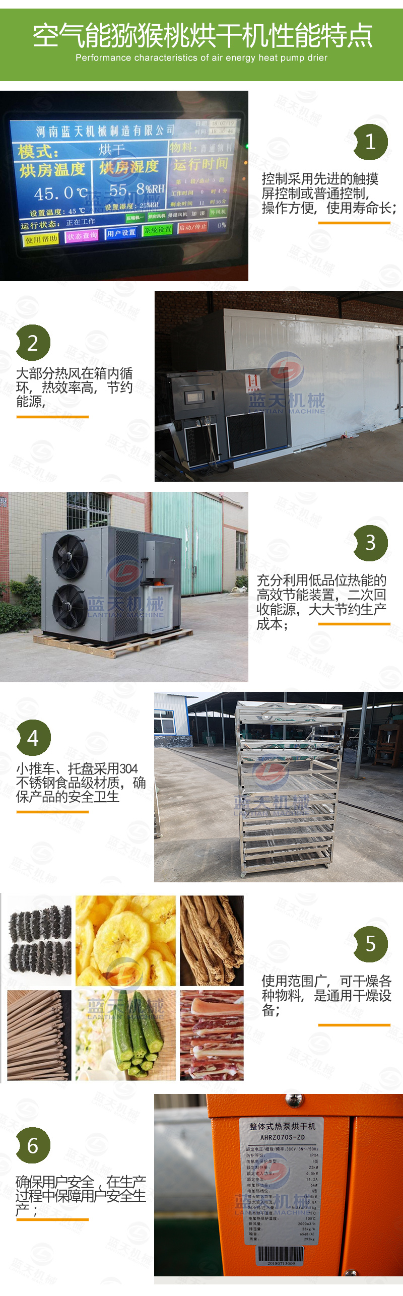 1.熱源空氣能熱泵機(jī)組。2.烘干機(jī)保溫房體。3.烘干機(jī)內(nèi)部熱風(fēng)循環(huán)裝置。4.自動(dòng)排濕裝置。5.溫濕度智能控制裝置。6.裝放獼猴桃干的物料小推車和物料托盤。