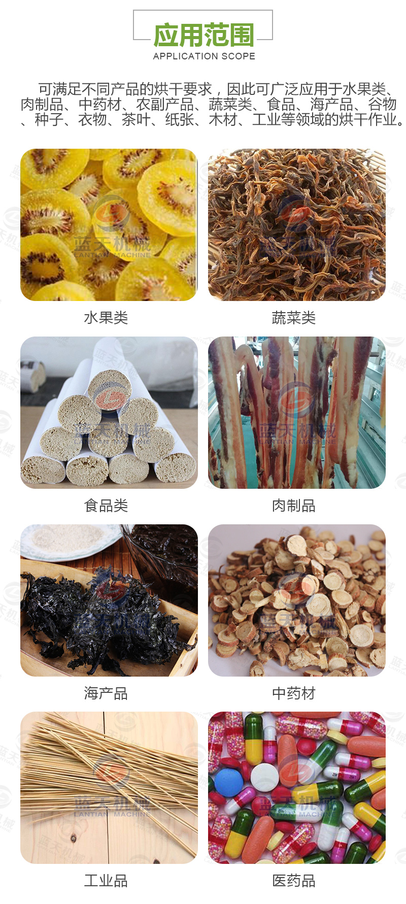 獼猴桃烘干機(jī)適用于:果蔬、果脯、肉制品、腸衣、煙葉、皮革、枸杞、烘干蔬菜類(辣椒等),食品(面條、掛面等)