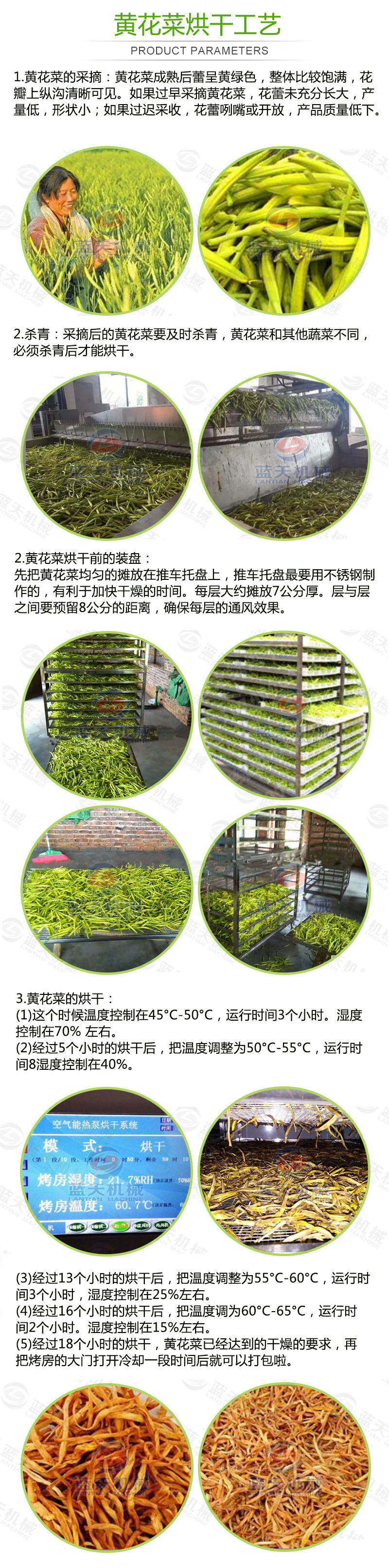 尾末的一段時間的烘干過程,要注意觀察黃花菜排水及干燥的程度,可根據(jù)干燥情況,繼續(xù)升高溫度,再烘干4小時左右,然后結(jié)束整個烘干流程。