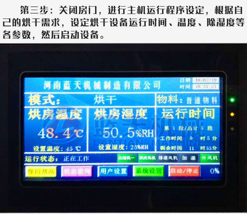 三:將盛放好豆角的物料車推入豆角烘干機設備內,關閉房門,進行主機運行程序設定,根據(jù)自己的烘干需求,設定烘干設備運行時間、溫度、除濕度等各參數(shù),然后啟動設備。