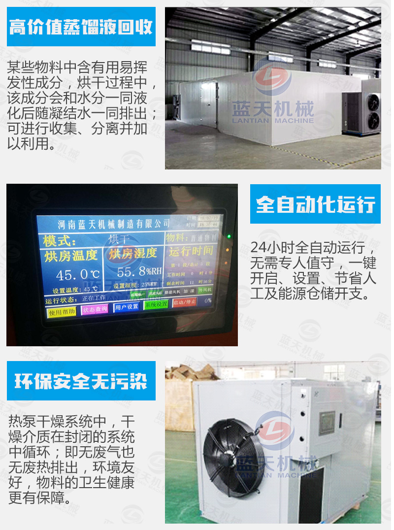 藍(lán)天海產(chǎn)品烘干機(jī)采用觸摸屏控制系統(tǒng),可實(shí)現(xiàn)多個(gè)時(shí)段曲線控溫,操作簡(jiǎn)單方便。海鮮烘干機(jī)吸收空氣的熱量并將其轉(zhuǎn)移到房?jī)?nèi),實(shí)現(xiàn)烘干機(jī)內(nèi)的溫度提高,配合相應(yīng)的除濕裝置實(shí)現(xiàn)海產(chǎn)品的烘干干燥。海產(chǎn)品烘干機(jī)設(shè)備由壓縮機(jī)-換熱器(內(nèi)機(jī))-節(jié)流器-吸熱器(外機(jī))-壓縮機(jī)等裝置構(gòu)成一個(gè)循環(huán)系統(tǒng)(主機(jī)+烘干機(jī))。冷媒在壓縮機(jī)的作用下在系統(tǒng)內(nèi)循環(huán)流動(dòng)。它在壓縮機(jī)內(nèi)完成氣態(tài)的升壓升溫過(guò)程(溫度高達(dá)115℃),它進(jìn)入內(nèi)機(jī)釋放出高溫?zé)崃考訜岷.a(chǎn)品烘干機(jī)內(nèi)空氣,同時(shí)自己被冷卻并轉(zhuǎn)化為流液態(tài),當(dāng)它運(yùn)行到外機(jī)后,液態(tài)迅速吸熱蒸發(fā)再次轉(zhuǎn)化為氣態(tài),同時(shí)溫度下降至零下20℃-30℃,這時(shí)吸熱器周邊的空氣就會(huì)源源不斷地將熱量傳遞給冷媒。冷媒不斷地循環(huán)就實(shí)現(xiàn)將空氣中的熱量搬運(yùn)到海鮮烘干機(jī)內(nèi)加熱機(jī)內(nèi)空氣溫度,從而實(shí)現(xiàn)能量的幾倍增長(zhǎng),消耗一度電產(chǎn)生的熱量相當(dāng)于傳統(tǒng)電熱絲的4倍以上,達(dá)到效率高節(jié)能的效果。