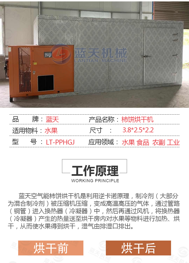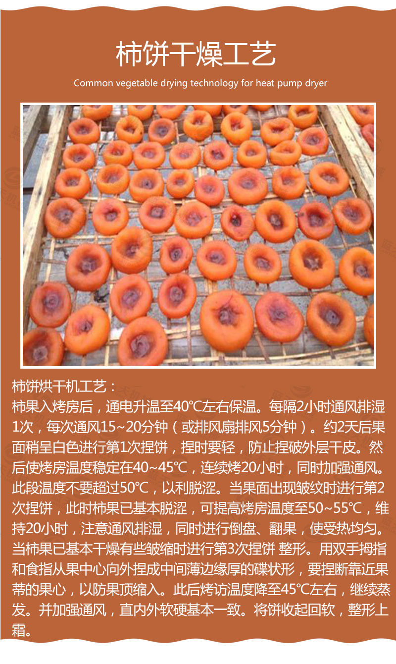 目前,國內(nèi)柿餅烘干加工工藝主要采取自然干制的傳統(tǒng)民間加工工藝。其主要流程為選果、去皮、日曬壓捏、脫色、捏曬整形、定型出霜然后包裝。由于自然干制的方法生產(chǎn)周期長,同時(shí)因長達(dá)數(shù)月的自然晾曬,微生物污染嚴(yán)重,因此產(chǎn)品的衛(wèi)生質(zhì)量差,自然干制還有占地多、用人多、用時(shí)長等缺點(diǎn),我們對柿餅用熱泵烘干的進(jìn)行研究,有了柿餅烘干機(jī)的產(chǎn)生,并取得突破性的成果。
