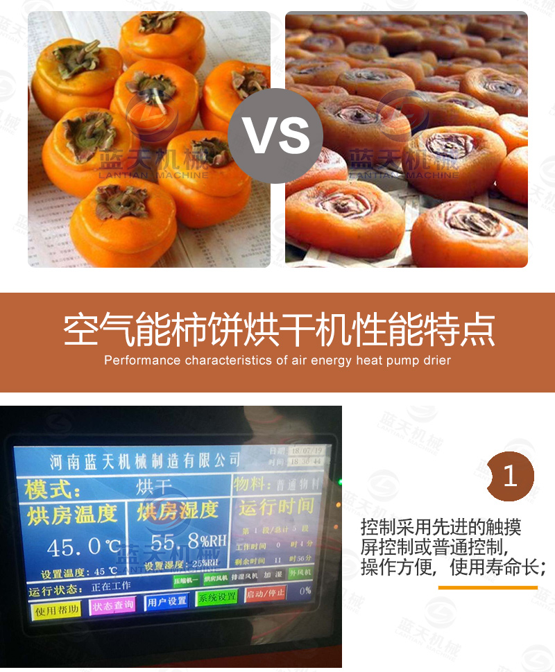 傳統(tǒng)的柿餅的生產(chǎn)周期傳統(tǒng)的自然晾曬所需要的一月有余,而采用熱泵柿餅烘干機(jī)則縮短到4-5天(根據(jù)使用時(shí)的溫濕度確定),并且在質(zhì)量上優(yōu)于自然涼曬的柿餅。在脫澀期溫度不能超過45度,濕度保持32%上下;前期烘烤期排濕不能太大,以免結(jié)皮太早以及影響回軟過程;第一次捏餅,第二次捏餅,手要輕,力要?jiǎng)?!大量脫水期溫度不能超過65度,濕度不能高于45度。統(tǒng)而言之為“兩烘兩停三捏”的全自動控制烘干方法。