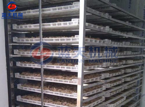 2:先將采收的文山三七挑選裝盤(pán),使用不銹鋼托盤(pán)、合理均勻?qū)⑷邤[放至托盤(pán)架中,每層間隔約為10厘米至15厘米,不宜鋪放太多,擺放以通風(fēng)透氣為佳,這樣每一層三七都能均勻受熱、干燥脫水。
