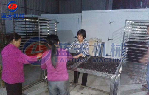 桑葚裝盤:使用桑葚烘干機干燥處理,時間要18個小時就可以干燥處理完了。一般每4公斤鮮桑葚可制成1公斤桑葚干。將經整理去雜后的桑葚裝篩子,裝入物料車內。每臺物料車不宜超過14個篩子,篩子層間距控制在10公分左右。以10P機為例,不要超過10臺物料車,以保證烘干房內有合理間隙位,利于熱風通過。
