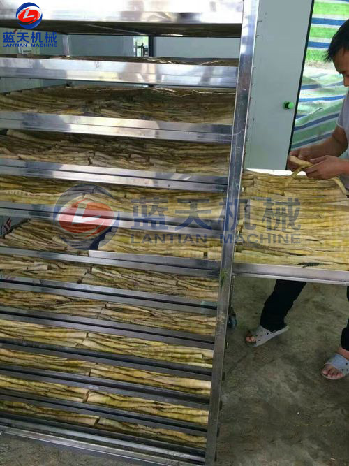 壓制好的片狀竹筍裝入物料車托盤,進(jìn)入烘干房進(jìn)行烘干。