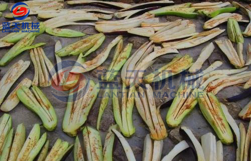 8.浸泡、烘干 將干茄瓣放在清水里浸泡20分鐘左右,讓其吸水膨脹變軟。然后用笊籬撈出,再放到烘干房內(nèi)進(jìn)行烘干,烘干溫度可以設(shè)定在60-65度之間。烘干至茄瓣表皮無水汁,質(zhì)量比剛浸泡完時(shí)略有減少,但仍較半成品重45%——50%時(shí)為宜。浸泡的目的是為了脫去部分鹽分及茄子的苦澀味。