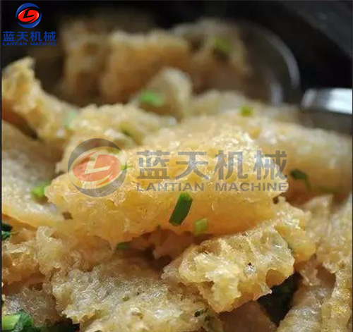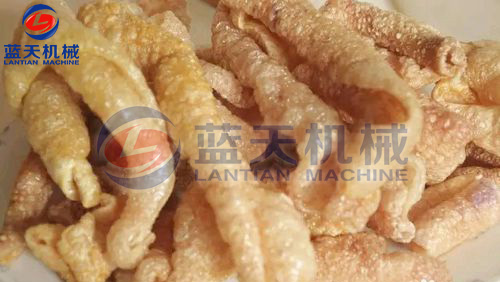 在油爆漲發前,豬皮需要在溫油中回軟,這是能否漲發的關鍵,油溫應該掌握在40-50度左右,溫度高了也會影響漲發的程度,是否回軟達標、視肉皮軟塌程度確定,這項操作標準在文字上無法準確清楚表述,只有在加工過程中熟能生巧,最終生產加工經驗是主要的。回軟后的待油爆肉皮應該保持回軟狀態不能回硬,將鍋中油溫升到80度后即可將肉皮放入油鍋中,邊翻動邊加溫,油溫達到120度時豬皮就可以漲發好了,在漲發時油溫應掌握好,不得過高,關鍵是保持不焦不老不黃的感官程度和完全漲發開的標準,完全漲發后的皮肚,從熱油鍋內撈出后應當控盡油脂并冷卻到常溫后方可包裝。不得未控盡油脂和降低溫度就進行包裝,否則既影響包裝又影響產品質量。