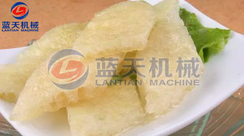 可選用煺毛后的、無疫病、無疤痕的豬皮。先將剝下的豬皮放入溫水中浸泡30分鐘,然后用竹刷或塑料刷刷洗,用刀刮除表皮上的污物,修凈污物,去凈雜毛并采取連根拔除的方法,盡量不用利刀刮毛的便利方法,避免將毛根留在肉皮內而影響成品品質,將殘留的肉皮表面的脂肪用刀修理干凈,要求不得殘留一絲脂肪,以免影響油爆漲發的程度,然后將清洗干凈、已去除脂肪的豬皮進行分切整形(有些地區的傳統工藝需要蒸煮后在分切),分切快形大小在5-10平方厘米之間,不得超過10平方厘米,否則油爆漲發后包裝困難,小于5平方厘米的自然皮塊也可以加工,無需再切成小塊和整形,否則經包裝、運輸、銷售環節后容易造成碎塊,根據市場需求也可以將豬皮切絲、切丁等形狀,以滿足不同的客戶需求,將切好的皮塊放入物料網格盤,將物料網格盤像抽屜一樣插入物料車,將物料車推入烘干房,關閉封閉門,烘干就可以開始了。