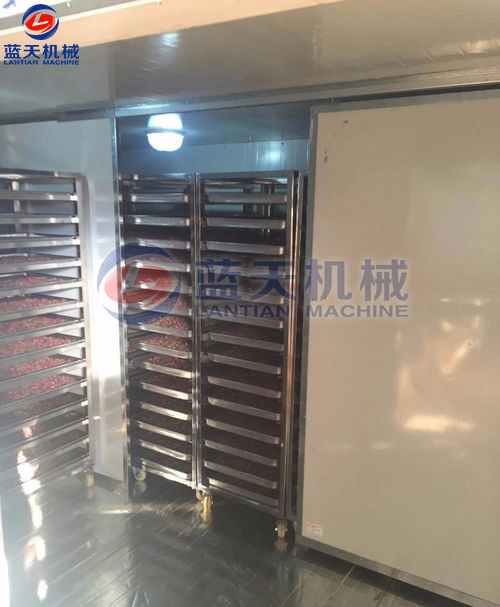 裝滿花蕾的物料車要輕輕推入烘干房,關閉烘干房室門升溫,嚴格控制室內(nèi)溫度、依次順序溫度慢慢提升,采用循環(huán)風路,確?;ɡ俑蓾窬鶆?,色澤鮮艷。