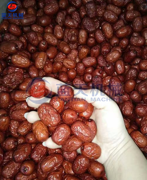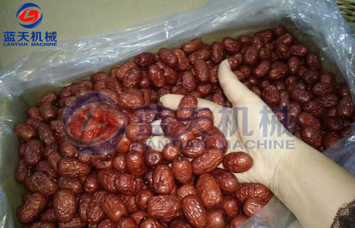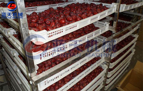 3、烘干工藝:先在熱水中瀝干棗表面的糖漿,然后裝入物料盤(pán),將物料盤(pán)物料車,推入烘干房,使含水量降至15%左右,烘干溫度開(kāi)始為50℃,過(guò)6-7小時(shí)升至70-80℃等棗皮發(fā)皺即可,用手摸感到外硬內(nèi)軟時(shí)取出包裝。