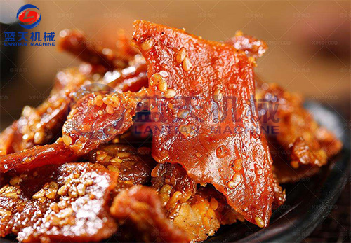 將出鍋的肉塊,置于不銹鋼網(wǎng)盤中或吊掛于烘烤推車上,然后推進(jìn)烘房?jī)?nèi)烘烤,溫度為45-60℃,烘烤時(shí)間為3-4小時(shí),即為豬肉干。