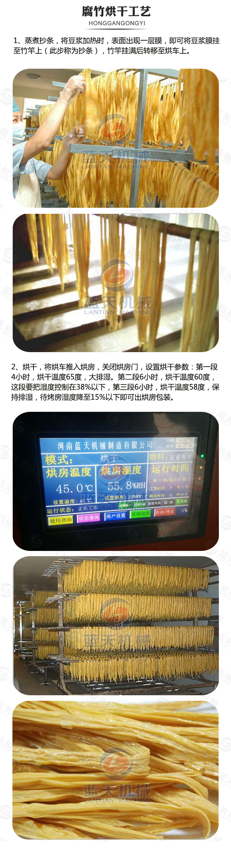 3:腐竹烘干一般經(jīng)歷預熱50-60℃、高溫烘干大量排濕階段65℃,、恒溫烘干階段60℃,相對濕度控制在50%以下,待水分降至15%左右,降溫階段,烘干時間約5小時,含水量約8%左右即可。這樣腐竹烘干機烘干的腐竹品質(zhì)好,表面的油份和光澤度適當,不易脆斷,保留了成品的色、香、味、形,且腐竹的損耗小。