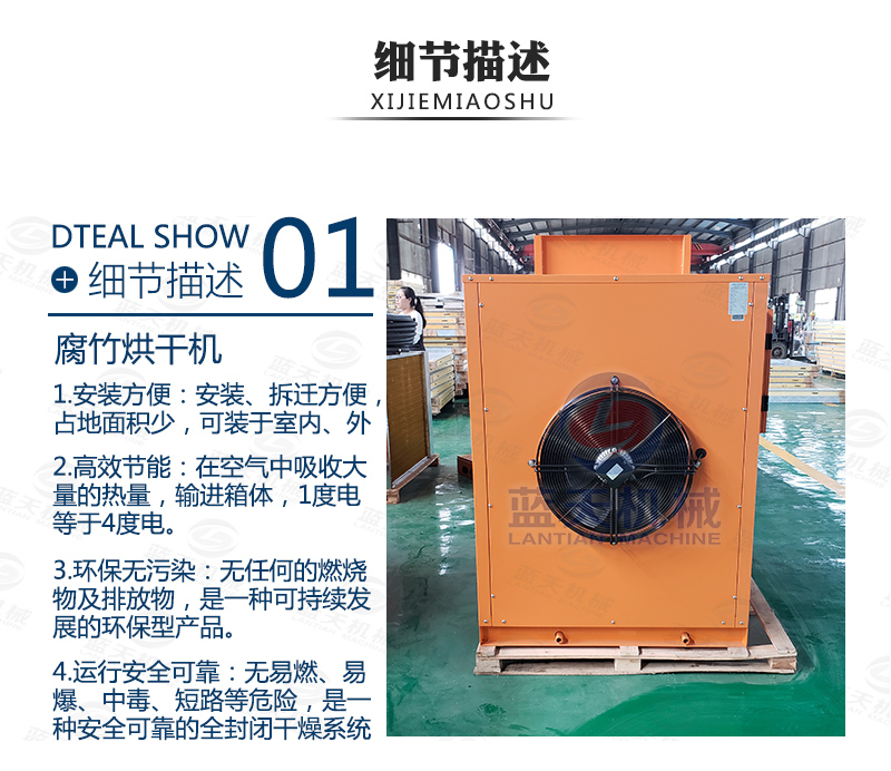 在很多地區(qū),腐竹烘干的市場也很大,近年來,隨著腐竹生產(chǎn)技術和烘干技術的提高,使用熱泵腐竹烘干機,不用燒煤、燒柴、不用鍋爐、蒸氣,只需少量的電能來驅(qū)動壓縮機就可以獲得所需要的高溫熱量,并且安全衛(wèi)生、環(huán)保沒有污染、無廢氣排放、運行電費超低。