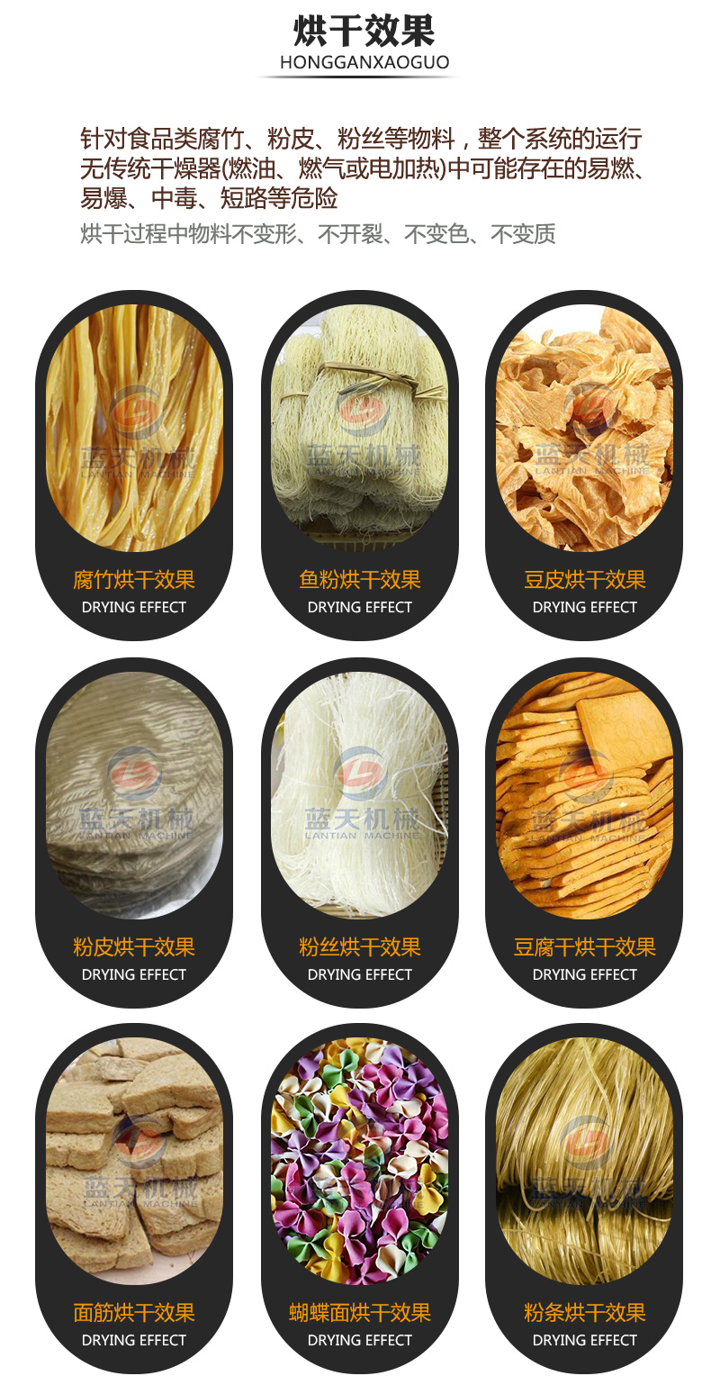 2:腐竹屬于食品類材料的烘干,用腐竹烘干機烘干腐竹的整個烘干過程需要注意控制好溫度,烘干過程需要保持濕度而不是快速除去濕度。同時,溫度控制決定了腐竹的膨化,表面的油份,色澤等重要品質(zhì)。另外,對于濕度控制不當,烘干過程,裝箱過程會導致腐竹脆斷,影響成品腐竹的產(chǎn)量,造成浪費。溫度太高容易斷裂或炸裂,影響外觀;溫度過低容易腐爛。另外定色定型,保證成品的外觀、飽滿度和復水性也相當重要,像面條、米粉、腐竹、豆腐干及菌菇類,如香菇、松茸、木耳、雞腿菇等等烘干過程也應注意上述原則。