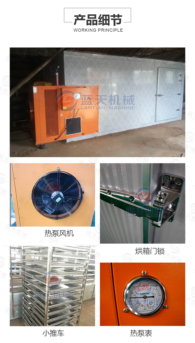 2.葡萄干烘干機(jī)熱泵烘干:托盤裝載量14~20kg/m~2,初溫45~50℃,終溫70~75℃;烘干時間42~60h。系統(tǒng)除濕量要大,脫水率已達(dá)70%。葡萄全干后仍保持綠色。烘干干燥適度的葡萄干,肉質(zhì)柔軟,用手緊壓無汁液滲出。含水量為 15%~17%,干燥率為3:1~4:1。