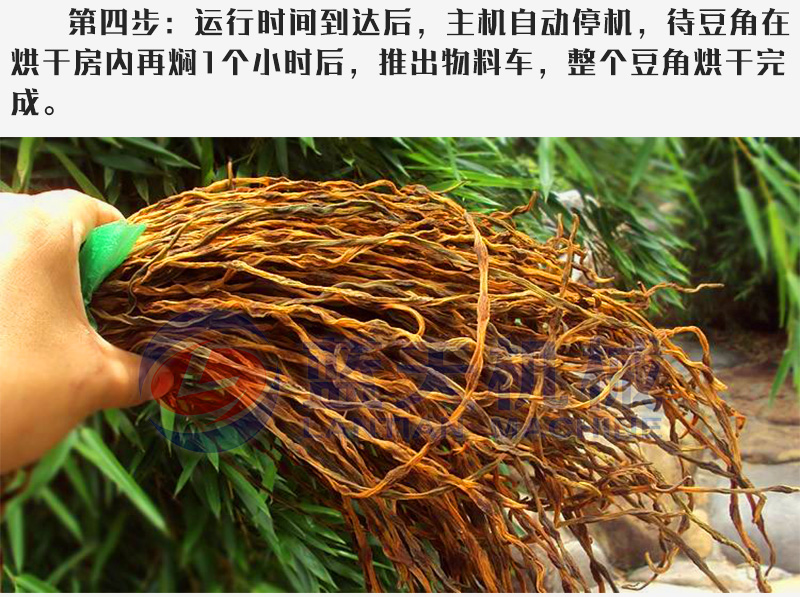四:運行時間到達后,主機自動停機,待豆角在豆角烘干機內再燜1個小時后,推出物料車,整個豆角烘干完成。