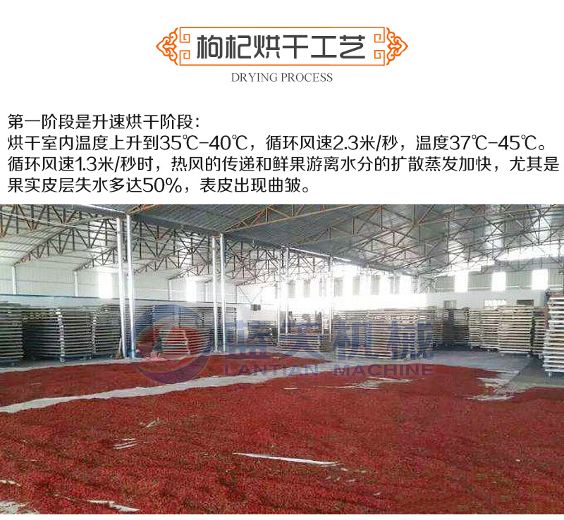 高濕低溫段,溫度小于50度,范圍40度~50度,避免高溫高濕造成枸杞顏色的變化,觀察枸杞表面水汽變化,隨時排潮,這段時間應在3~3.5小時。
