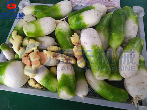 1、將新鮮出土的白蘿卜清洗干凈,量大的情況下,建議您可以選用毛輥脫皮清洗機,清洗量大,速度快,效率高,您從圖片中可以看出來,清洗機不僅僅可清洗白蘿卜,還可以清洗其他物料,如:大姜、紅薯、土豆等