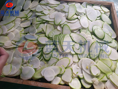 3、經過前兩道工序后,把蘿卜片平鋪在蘿卜片烘干機的物料托盤上,推進蔬菜烘干機進行烘干